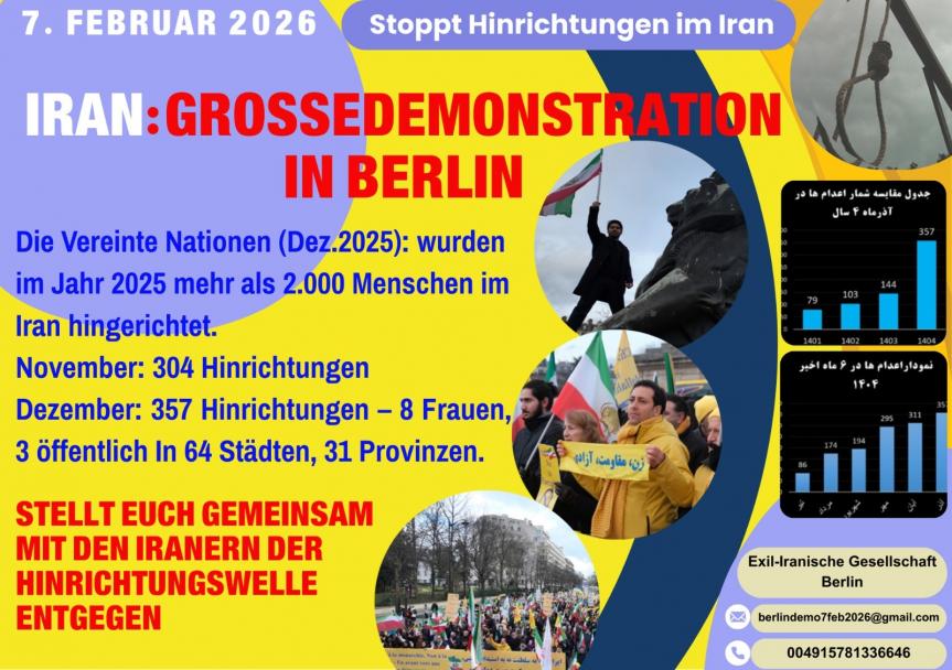 Laut den Vereinten Nationen wurden im Iran allein im Jahr 2025 rund 2000 Personen hingerichtet. Über 150 Tötungen pro Tag - davon viele unschuldig. Das ist nicht mehr zeitgemäß! Deswegen fordert die Exil-Iranische Gesellschaft ein entschiedenes Auftreten gegen die religiösen Fanatiker an der Regierung des Landes.
